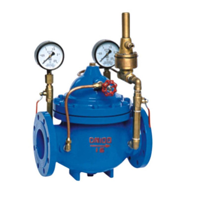 400X流量控制阀由主阀、流量调节阀、针阀、导阀、球阀、微形过滤器和压力表组成水力控制接管系统。利用水力自动操作,控制和调节主阀开度,使通过主阀的流量保持不变。本产品利用水力自力控制,不需要其它装置和能源,保养简便,流量控制稳定。400X流量控制阀适用于高层建筑、生活区等供水管网系统及城市供水工程。